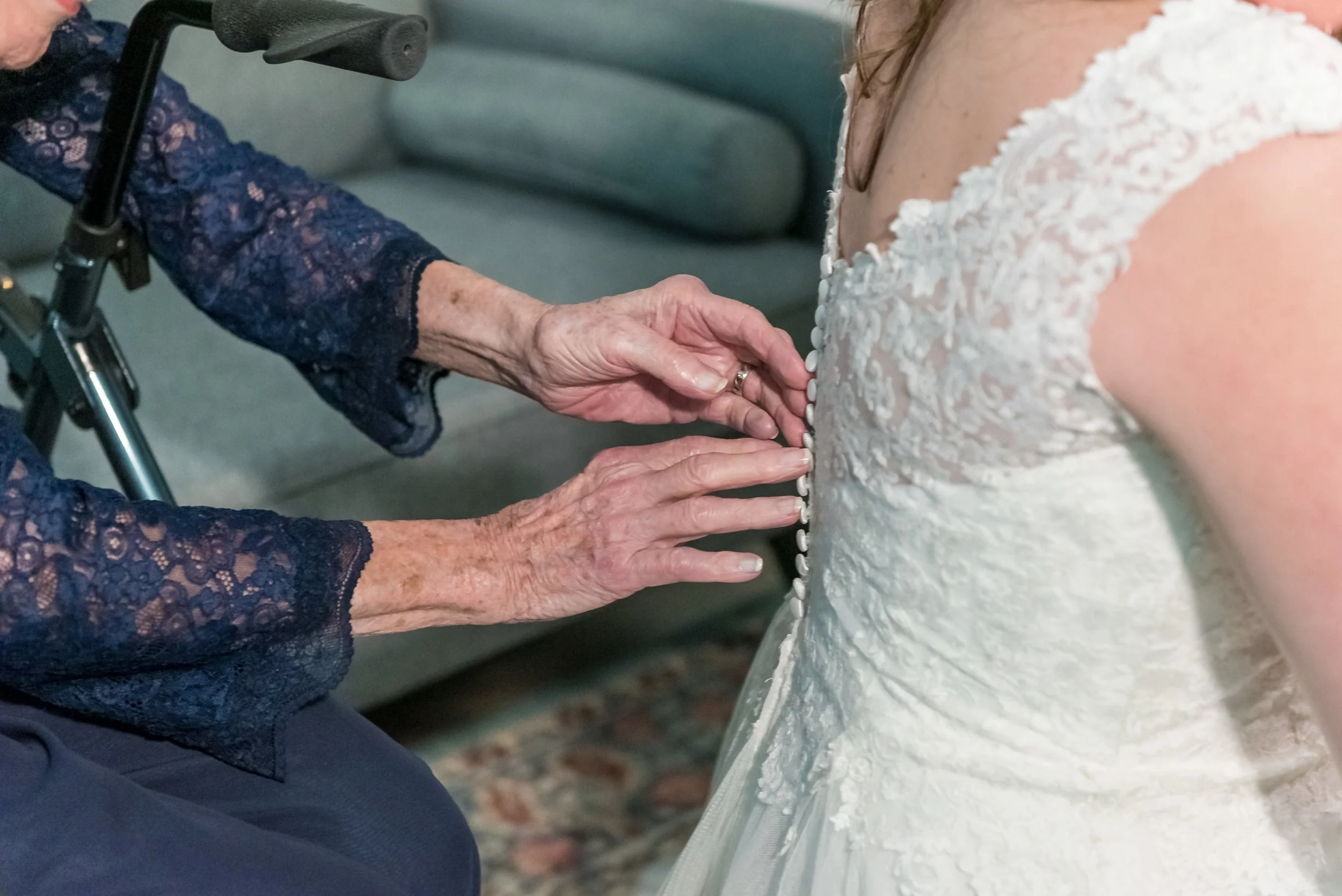 The experience begins with an in-store sizing and consultation, where the bride selects up to six gowns to try on. Then, we bring those gowns to her chosen location-whether it's a hospital, or care facility— so she can create a beautiful, shared moment with her loved ones.
